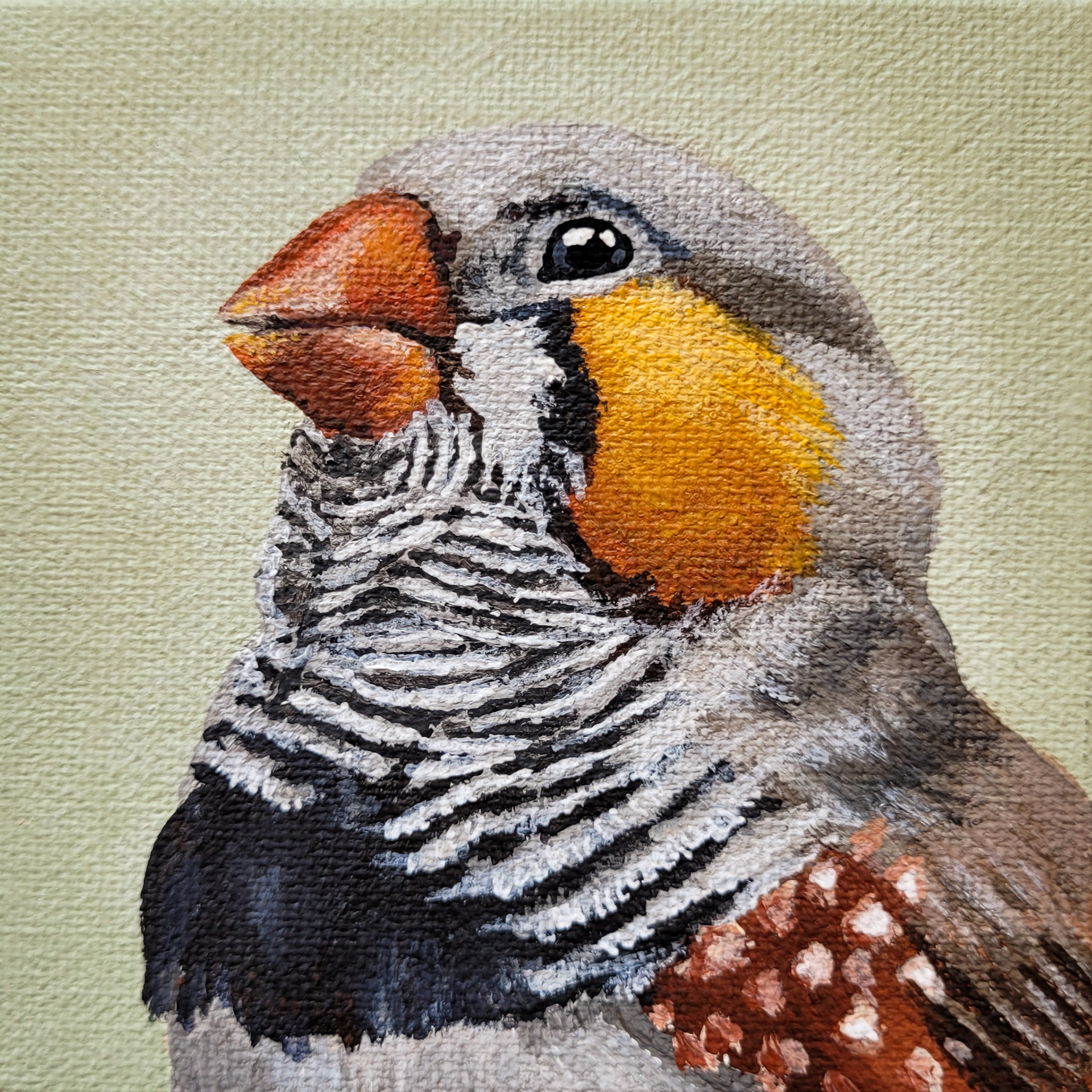 These are small 10 x 10cm individual canvas that were painted in acrylic to form a single work of 30 Australian bird portraits. It was then framed in aluminium.
